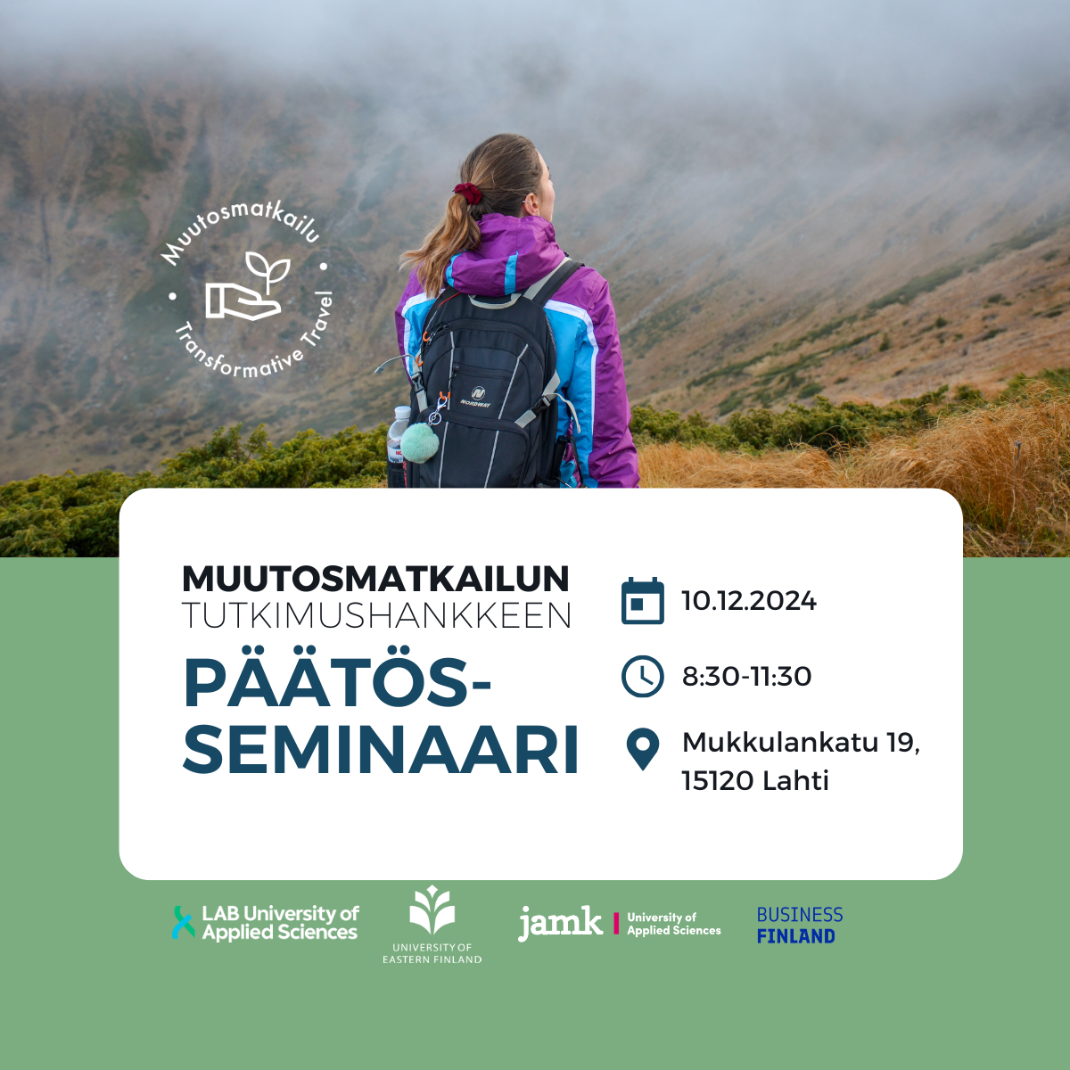 Seminaarissa pureudumme muutosmatkailun eri näkökulmiin ja esittelemme hankkeemme tärkeimmät löydökset. Lisäksi julkaisemme sähköisen työkalupakin, joka tarjoaa konkreettisia ratkaisuja ja työkaluja matkailualan toimijoille.